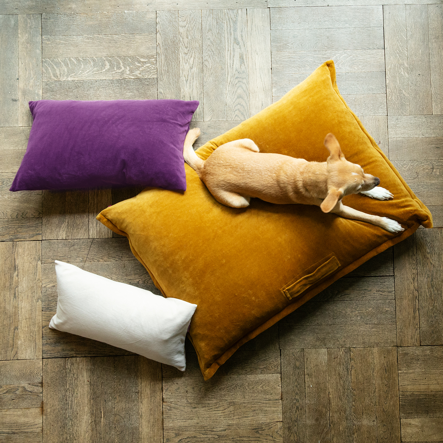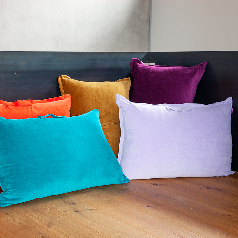 Pillow Take Away , complete This pillow lives up to its name. It is absolutely perfect when additional seating is required, whether for two or four-legged friends. Filled with a vegan siliconized hollow fiber filling, it's easy to carry from place to place and returns back to its original shape after use. It has its own Ökotex test number and a seamless zipper.